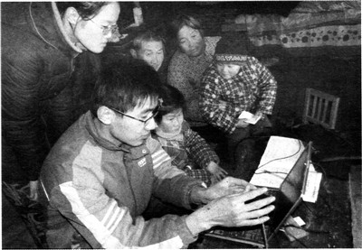春节期间,聊城大学文学院的3名志愿者来到许营乡留守儿童杜慧敏家中,通过QQ视频聊天和寄送刻录光盘的形式,让在北京打工的杜万国夫妇能够了解孩子的生活、学习情况,为他们传递一份浓浓的亲情。图为一名大学生在为杜惠敏播放拍摄的DV。 通讯员 徐长春 摄