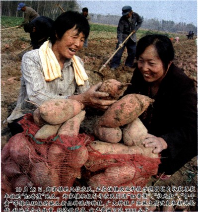 10月18日,郑家镇的几位农民,正在该镇农业科技示范园区内收获喜获丰收的“红香蕉”地瓜。郑家镇积极引导农民引进“红香蕉”、“状元红”、“鲁中黄”等绿色环保的地瓜新品种进行种植,广大种植户实施土质改良和耕地轮作,秋地瓜个大体重,经济效益高,亩产普遍可达3000公斤。 通讯员 李学贵 摄