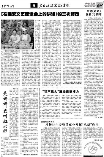通过对《在延安文艺座谈会上的讲话》三次修改情况的梳理,我们可以看出:毛泽东绝不把《在延安文艺座谈会上的讲话》等重要文献看成终极真理,而是随时注意总结历史规律和发展经验,使这些思想日臻完善。同时,这一过程也生动地告诉我们,马克思主义不是停滞不前,而是与时俱进,不断发展完善的。