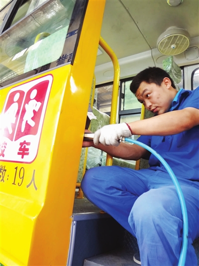 6月13日,聊城中通轻型客车有限公司员工于东涛正在认真安装校车内部设施。中通轻客自主研发的LCK6551D3X型轻型校车,配备多项安全系统,能够有效保障司乘人员安全,产品销往全国各地。 通讯员 史怀征 摄