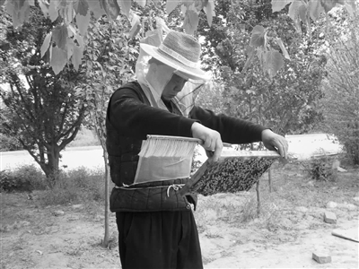 说话间隙,姜老汉拿起两顶纱帽,带着记者走进了养蜂场,面积大约有100平方米,蜂箱整齐的排放着,每个蜂箱周围都围着许多蜜蜂,很是壮观。姜老汉打开一个蜂箱,抽出一块蜡板,板上密密麻麻爬满了蜜蜂。“你看这扇又满了!”戴着面罩的姜玉贤对身旁的老伴说道。和蔼的笑容里多了一份满足,他轻轻驱赶着巢框上的蜜蜂,小精灵们像调皮的孩子,放肆地围着他,密密匝匝的六菱形蜂巢上滴沥着黏稠的蜜汁。回到屋里,满头大汗的姜老汉喝了口水,接着说,“退休金已经足够我们老两口的花销了,但是,养蜂让我们老有所乐,与这些‘小精灵’在一起,才不觉得孤单。”
