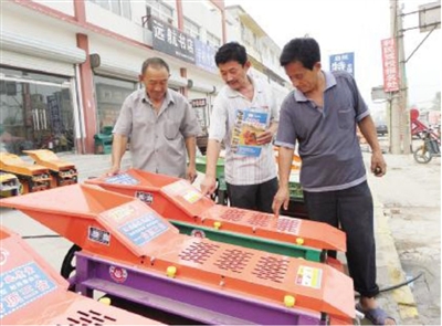 8月31日,在于集镇农机销售点,农民正在选购农机。三秋临近,玉米脱皮机、脱粒机、手扶拖拉机、播种镂、地膜覆盖机等小型农机具因体型小、易操作、耗能低,非常适合温室大棚作业,受到农民的青睐,迅速占领于集市场。 特约记者 王志荣 摄