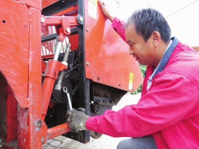 秋收即将到来,张炉集镇积极组织全镇47个村的农机操作人员进行岗前安全培训,并对所有农机进行检查维修,确保不发生安全事故。图为:树民正在检修机器。
