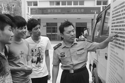 为进一步加强国防教育和征兵宣传工作,吸引更多具有高中学历的适龄青年响应祖国召唤,献身国防事业。6月26日,区人武部、区直机关武装部在聊城四中开展征兵宣传暨国防教育走进校园活动,图文并茂的政策宣传展板吸引了许多学生争相观看。图为工作人员向前来咨询的学生热情讲解兵役法规和预征政策。实习记者 杨威 通讯员 王平 摄