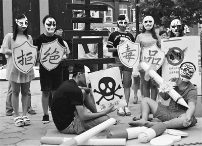 6月26日,为迎接国际禁毒日,聊城大学美术学院的大学生禁毒志愿者在新区街道八一社区开展以“珍惜生命、远离毒品”为主题的行为艺术禁毒宣传活动,警示人们远离毒品、健康生活。图为禁毒志愿者用行为艺术展现吸食毒品对人体的危害。