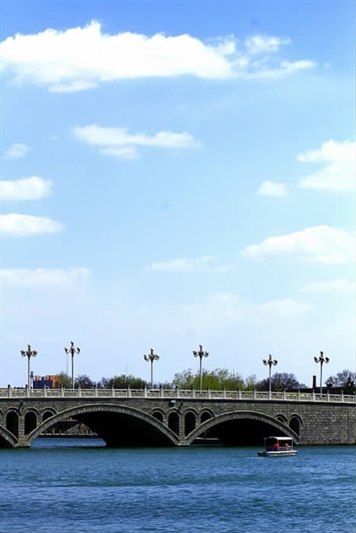 巍峨的古城墙高耸绵延,诉说着东昌府悠远的历史,绿树掩映中,光岳楼散发着古朴庄严。湖中心美丽的小岛静静矗立,高升桥如一条玉龙般俊俏挺拔,南边的卧波桥,取意唐代诗人杜牧的"长虹卧波“之意,东西长百余米,两边的汉白玉桥栏上雕刻着精美的水浒传人物,“水浒108将”。桥下有24个桥孔,让人想起“二十四孔明月夜”这样的佳句。