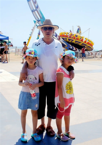 东关民族小学的学生姬雨萱(左一)和爸爸在日照海滨浴场合影。