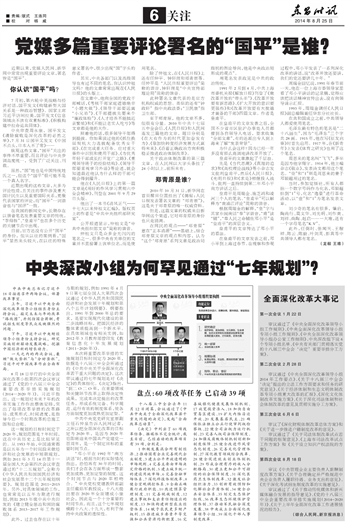 中央审查周永康,国平发文《清除腐败是深化改革的必然之举》,7月31日国平又发文《中国不点头,日本入不了常》……