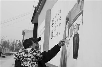今年以来,新区街道以墙面作为精神文明宣传的重要阵地,通过图文并茂的形式,以传统行为规范与“四德”榜样相结合,营造良好的道德氛围,在辖区内劲吹“道德风”。图为旗杆王村民观看村内新粉刷的道德墙。本报记者李可新通讯员谢锦花