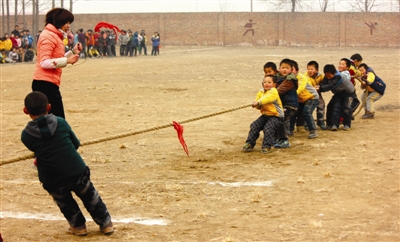 日前,郑家镇温集小学以“和谐校园,和谐师生,放飞心情,展示风采”为主题,举行了首届师生趣味运动会。图为学生拔河比赛现场。