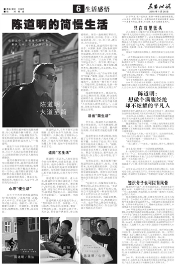 有朋友会问:他在家都干嘛?陈道明说什么都没干,发呆。在他看来,发呆是最放松的事。尝试把自己脑袋放空,哪怕只有几分钟,其实就挺幸福的。他的生活正如他自己曾经在序言中写道:“世间万物由简至繁走到今天,该由繁至简了。”