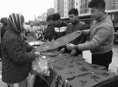“用废旧报纸或饮料瓶可换春联年画。”1月31日,柳园办事处文苑社区联合大学生自愿者举办的“绿色环保过春节”的活动现场,市民用收集到的废旧报纸或饮料瓶,换到了春联和年画。通过活动的开展,既宣传了低碳环保理念,又传承了中国传统文化,同时也给千家万户送去了新春的祝福。 本报记者 杜宁 特约记者 李洪广 摄
