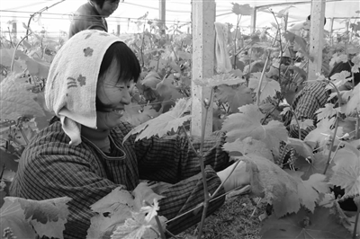 4月6日,工人在为葡萄绑蔓、掐枝。近年来我区积极鼓励扶持农民流转土地,大力发展集约化生产,组建专业合作社,促进了农业结构调整,实现了农业增收、农民增收。张炉集镇孙坊村的孙振民流转土地300亩,种植了大棚葡萄,收益可观。 本报记者杜宁通讯员李乐云张建光摄