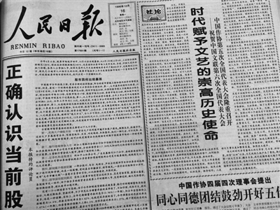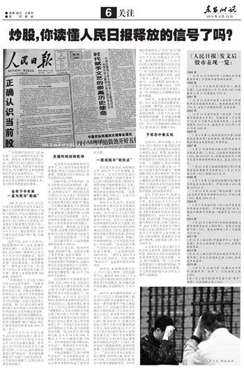 1996年12月16日,《人民日报》发表特约评论员文章《正确认识当前股票市场》扼住了A股上涨势头,开社论调控股市先河到。转眼近20年,现在股市文章在《人民日报》上已是常见,但是放在头版重要位置的只有三篇,除了最早的两篇,还有2009年6月9日一篇记者述评。另有几篇刊登在其海外版头版,引起广泛关注。