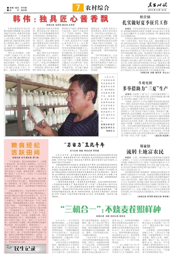 6月14日,一台大型多功能种肥同播机,正在梁水镇镇冯段王村村民王三利的麦茬田里进行播种,王三利站在地头笑呵呵地说:“种肥同播新技术不但省时省工、效益也很好,不灭麦茬连种带肥一块下地的新种法,让俺这种了半辈子地的人太省心了!”