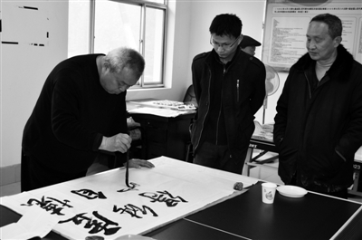 3月15日,社区老年文体活动室内,老年书画爱好者挥毫泼墨,切磋交流,展示中华传统书画艺术。