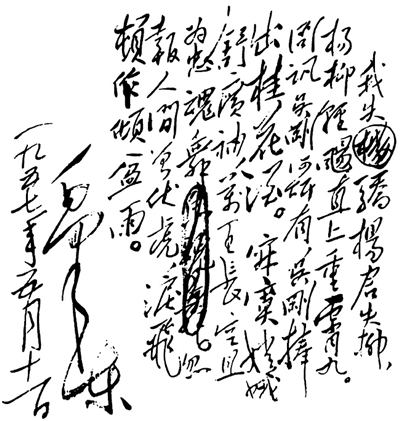 1957年毛泽东写下著名的词作《蝶恋花·答李淑一》:“我失骄杨君失柳,杨柳轻飏直上重霄九。问讯吴刚何所有,吴刚捧出桂花酒。寂寞嫦娥舒广袖,万里长空且为忠魂舞。忽报人间曾伏虎,泪飞顿作倾盆雨。”