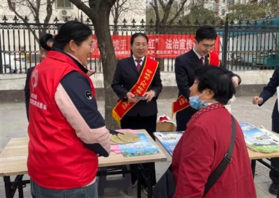 为大力弘扬法治精神,增强社区居民知法、懂法、守法、用法意识,新区街道广场社区联合市人民检察院第三检察支部开展“‘检察蓝’携手‘社区红’,法治宣传进社区”主题活动。